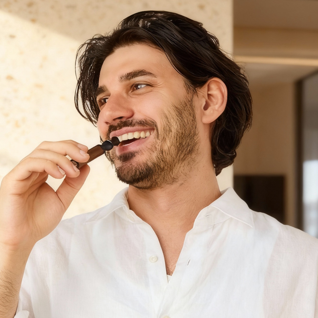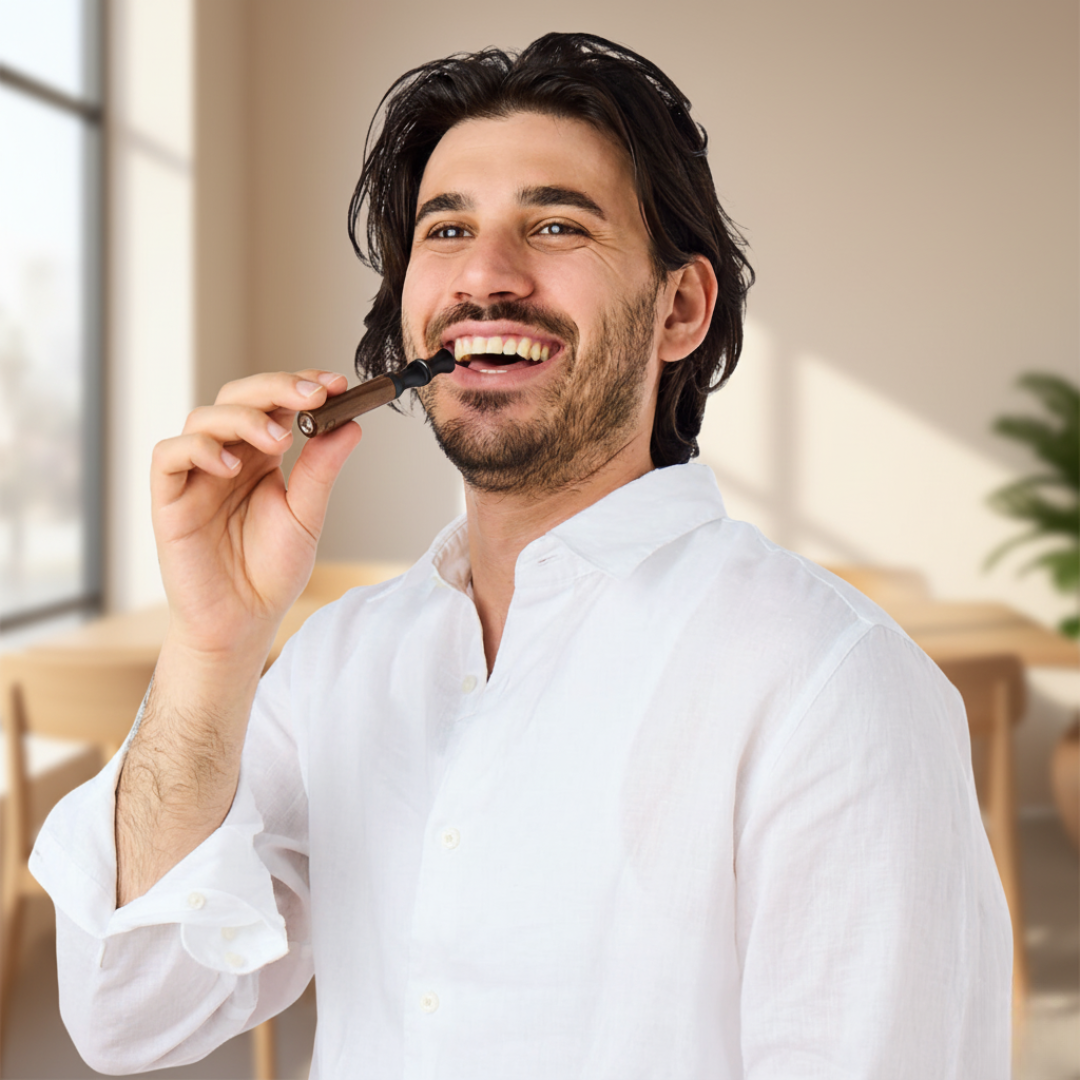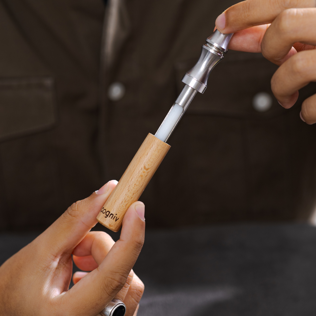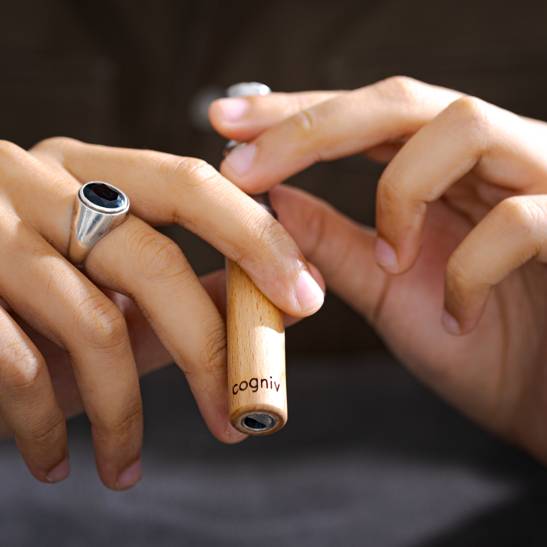Cogniv replaces the behavioral ritual that patches and gum miss. It satisfies the hand-to-mouth motion and deep breath that cause relapses, using natural essential oils instead of nicotine.
