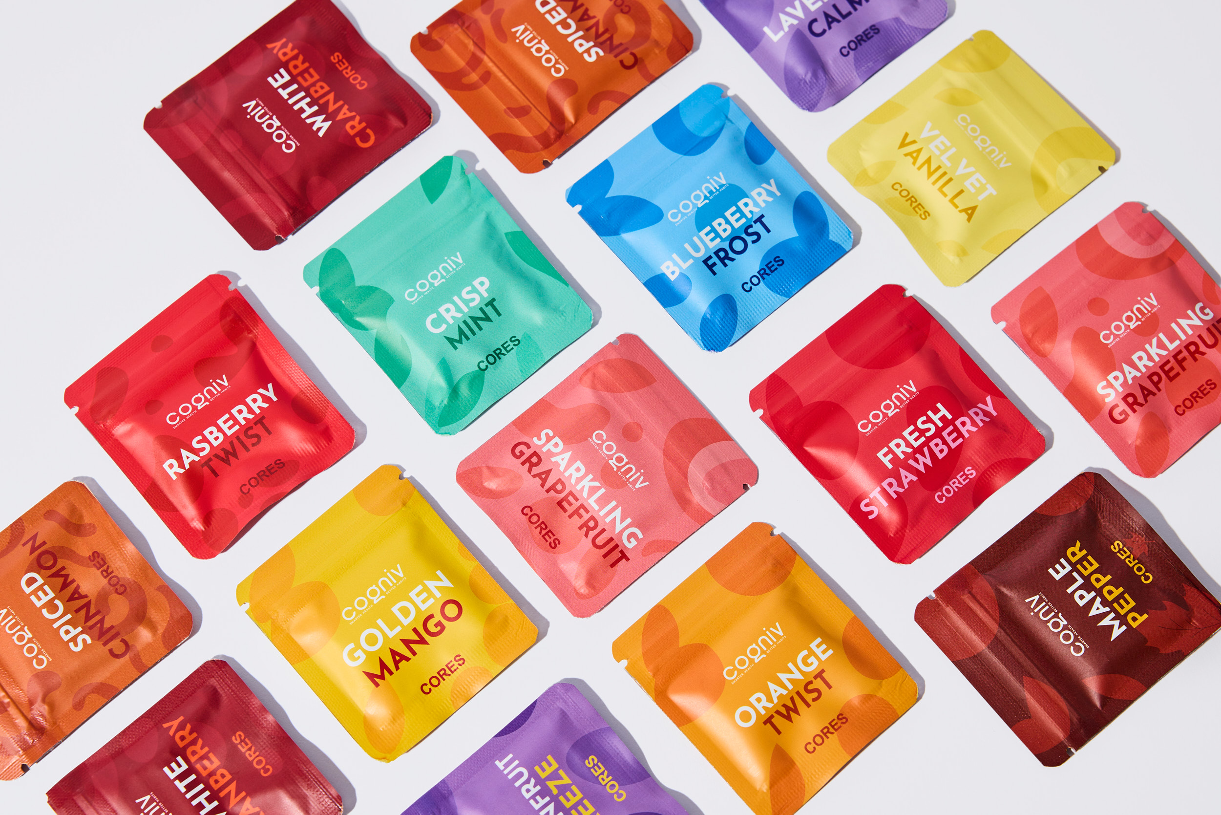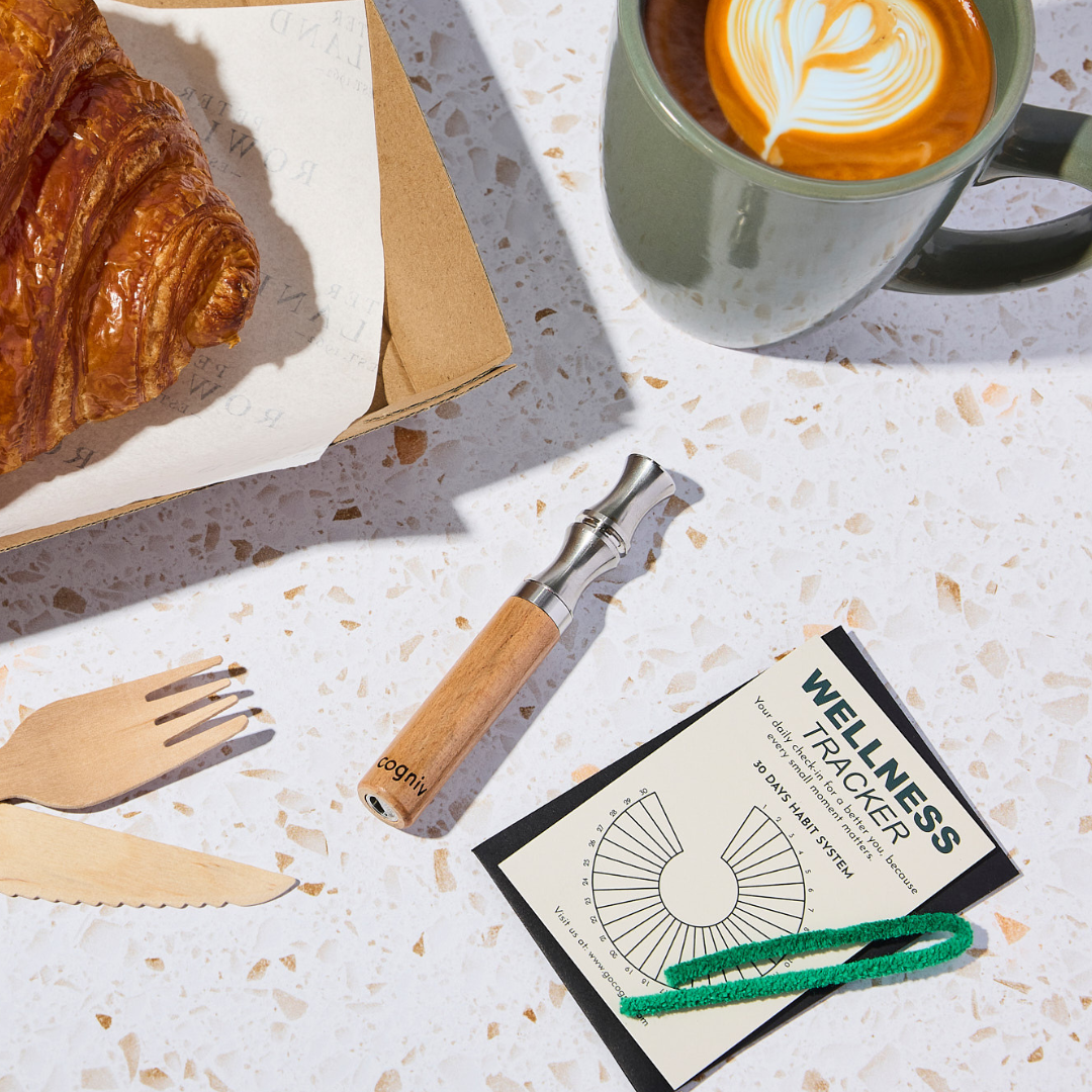 Cogniv device (Maple or Onyx), flavor cores, carry bag, cleaning brush, and habit tracker. Everything you need to start.
